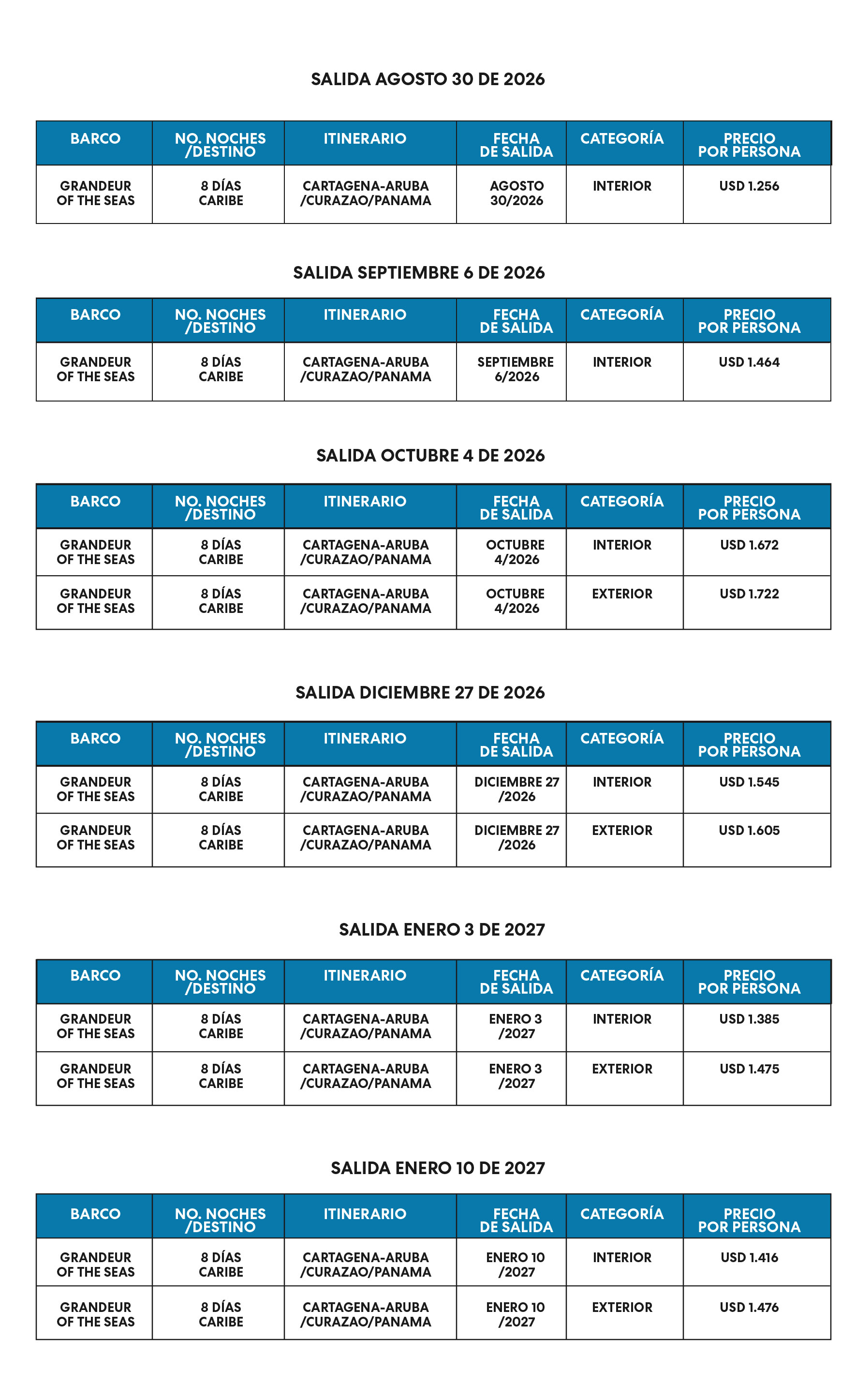 El impuesto de salida desde el Puerto no está incluido, este será informado 30 días antes de la fecha de salida, valor sujeto a cambio.