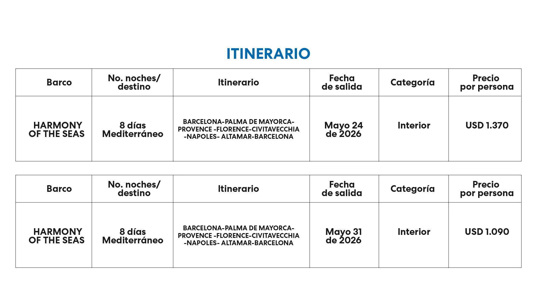 Nota: El impuesto de salida desde el Puerto no está incluido, este será informado 30 días antes de la fecha de salida, valor sujeto a cambio.